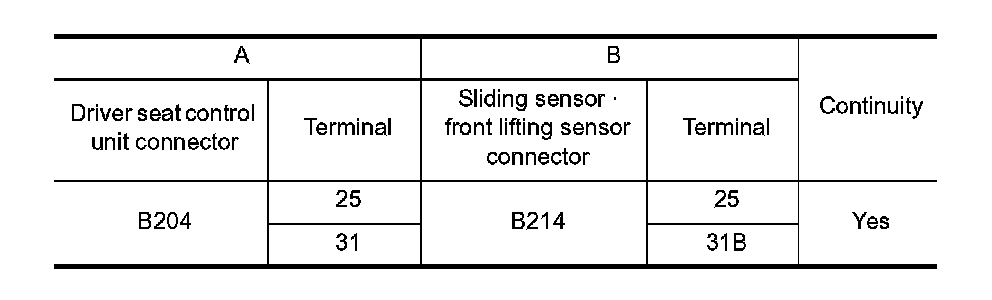 2. Check continuity between driver seat control unit connector and sliding sensor front lifting sensor connector.