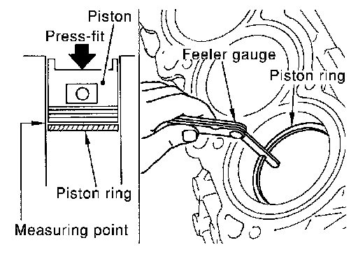 - Lubricate with new engine oil to piston and piston ring, and then insert piston ring until middle of cylinder with piston, and measure the piston ring end gap with feeler gauge.