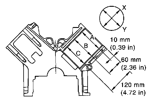 - Using bore gauge, measure cylinder bore for wear, out-of-round and taper at six different points on each cylinder. ("X" and "Y" directions at "A", "B" and "C") ("X" is in longitudinal direction of engine)