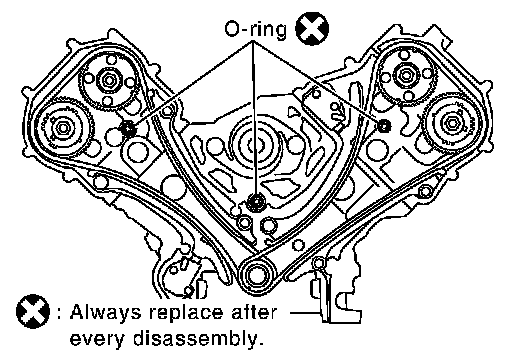 - To install timing chain and related parts, start with those on right bank. The procedure for installing parts on left bank is omitted because it is the same as that for installation on right bank.