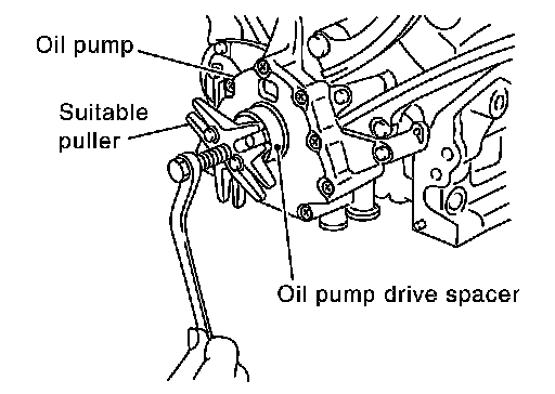 on front surface. Using suitable puller, pull oil pump drive spacer off from crankshaft.