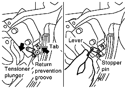 a. Press tab in the direction of arrow (or turn lever in the direction of arrow) to unlock the locking with the groove that stops tensioner plunger from returning.