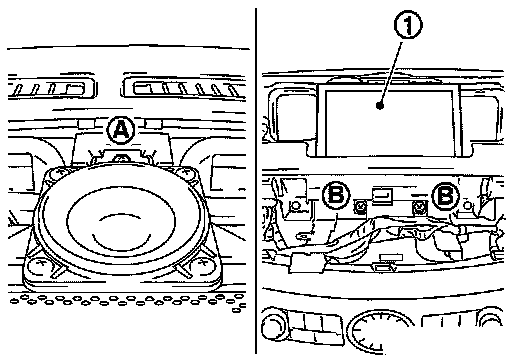 4. Remove screws (B) and disconnect connector, and remove display (1) center speaker comes off accordingly.