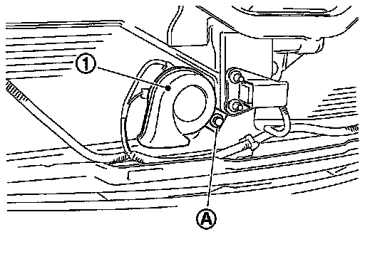 6. Remove horn (LO) mounting bolts (A), and remove horn (LO) (1) from vehicle.