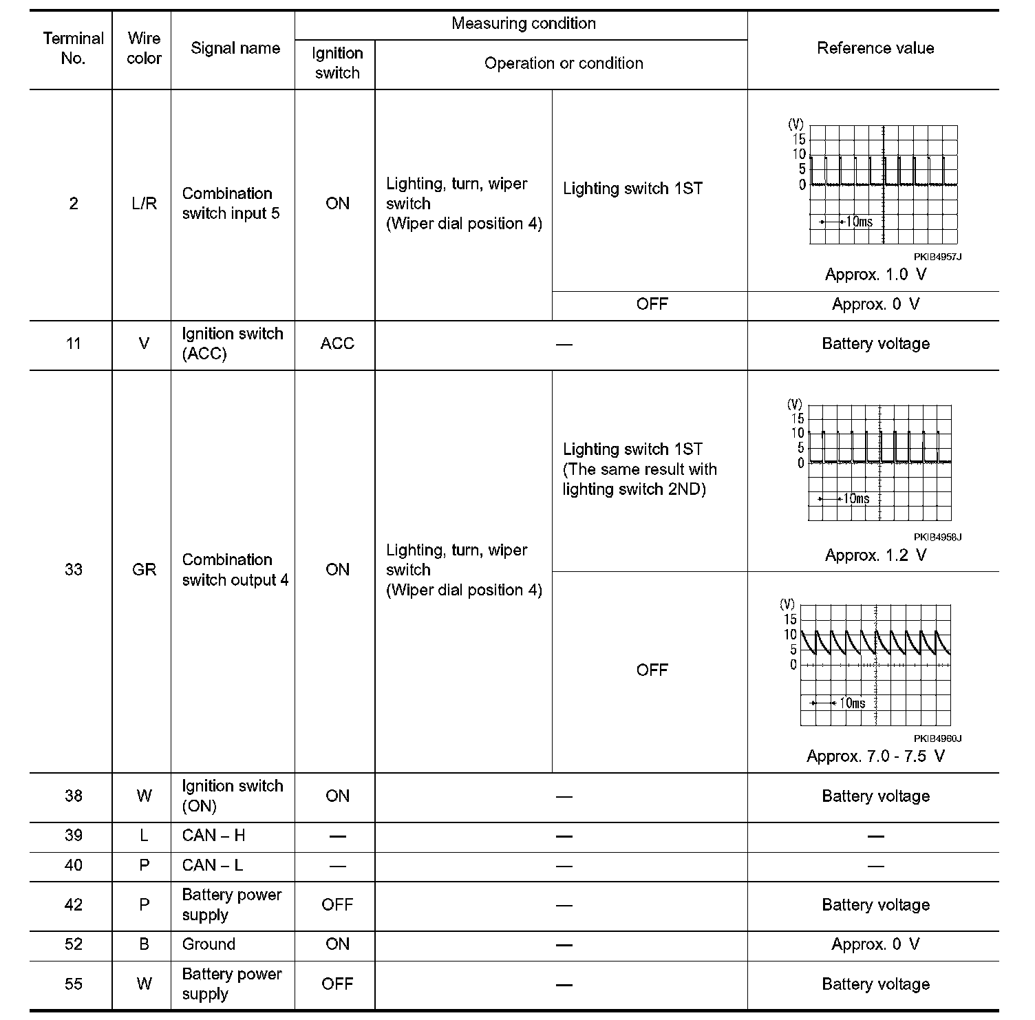 - Check combination switch system terminal waveform under the loaded condition with lighting switch, turn signal switch and wiper switch OFF not to be fluctuated by overloaded.