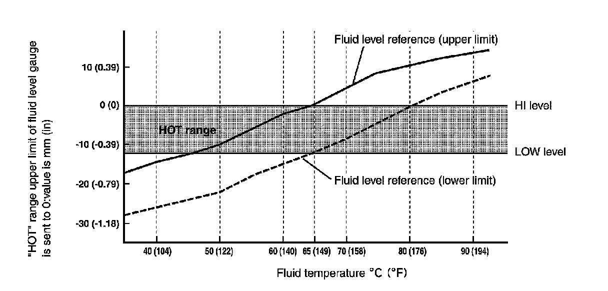 7. Re-check A/T fluid level at A/T fluid temperatures of approximately 65�C (149�F) using "HOT" range on A/T fluid level gauge.