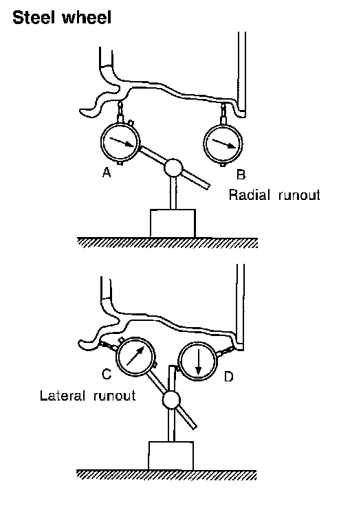 2. Check wheels for deformation, cracks and other damage. If deformed, remove wheel and check wheel runout.