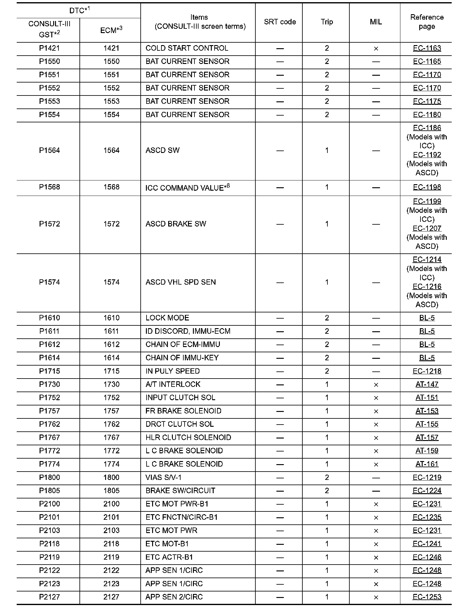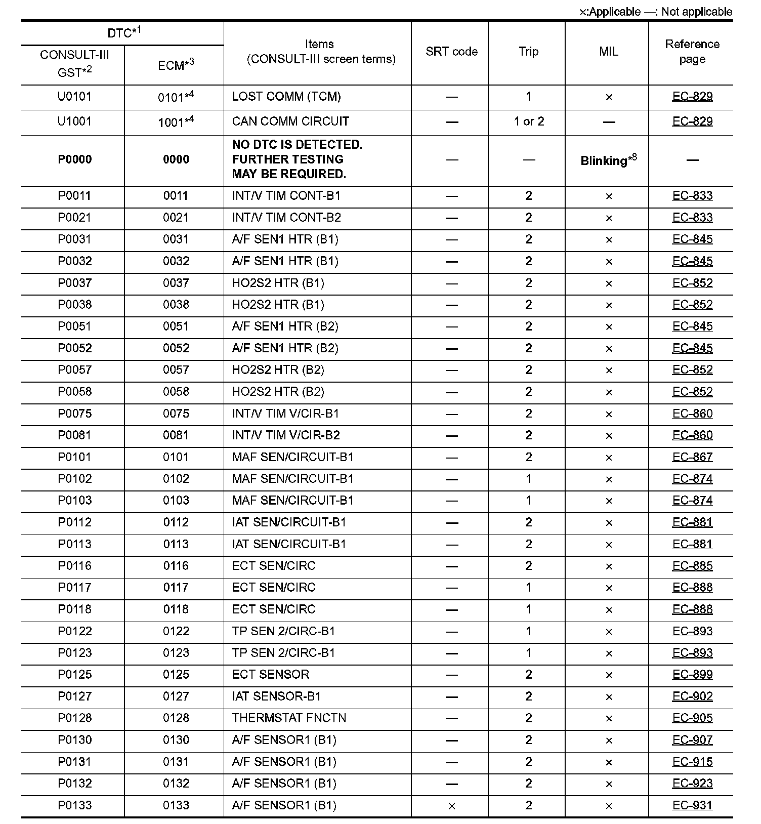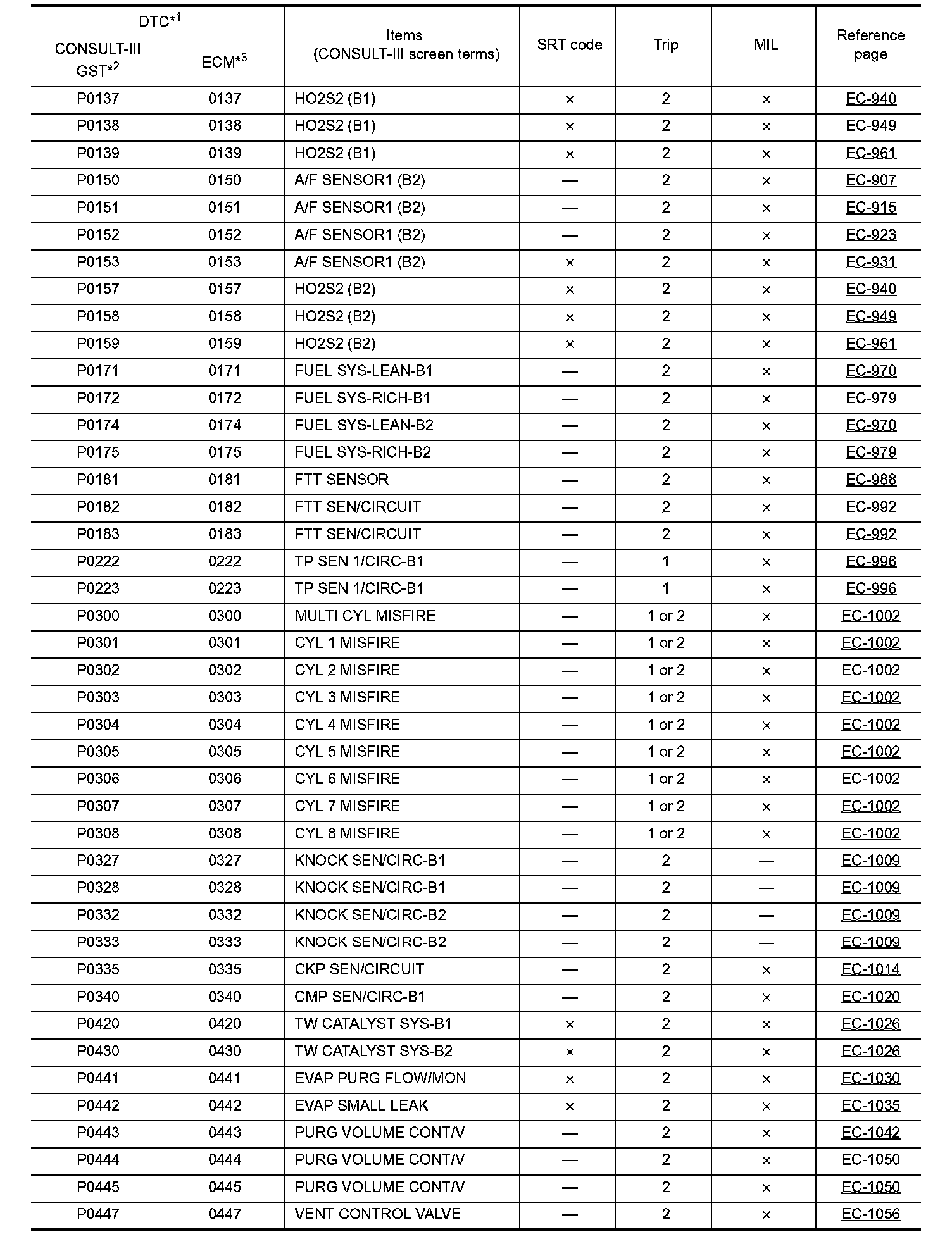 For malfunctions in which 1st trip DTCs are displayed, refer to "EMISSION-RELATED DIAGNOSTIC INFORMATION ITEMS". These items are required by legal regulations to continuously monitor the system/component. In addition, the items monitored non-continuously are also displayed on CONSULT-III.