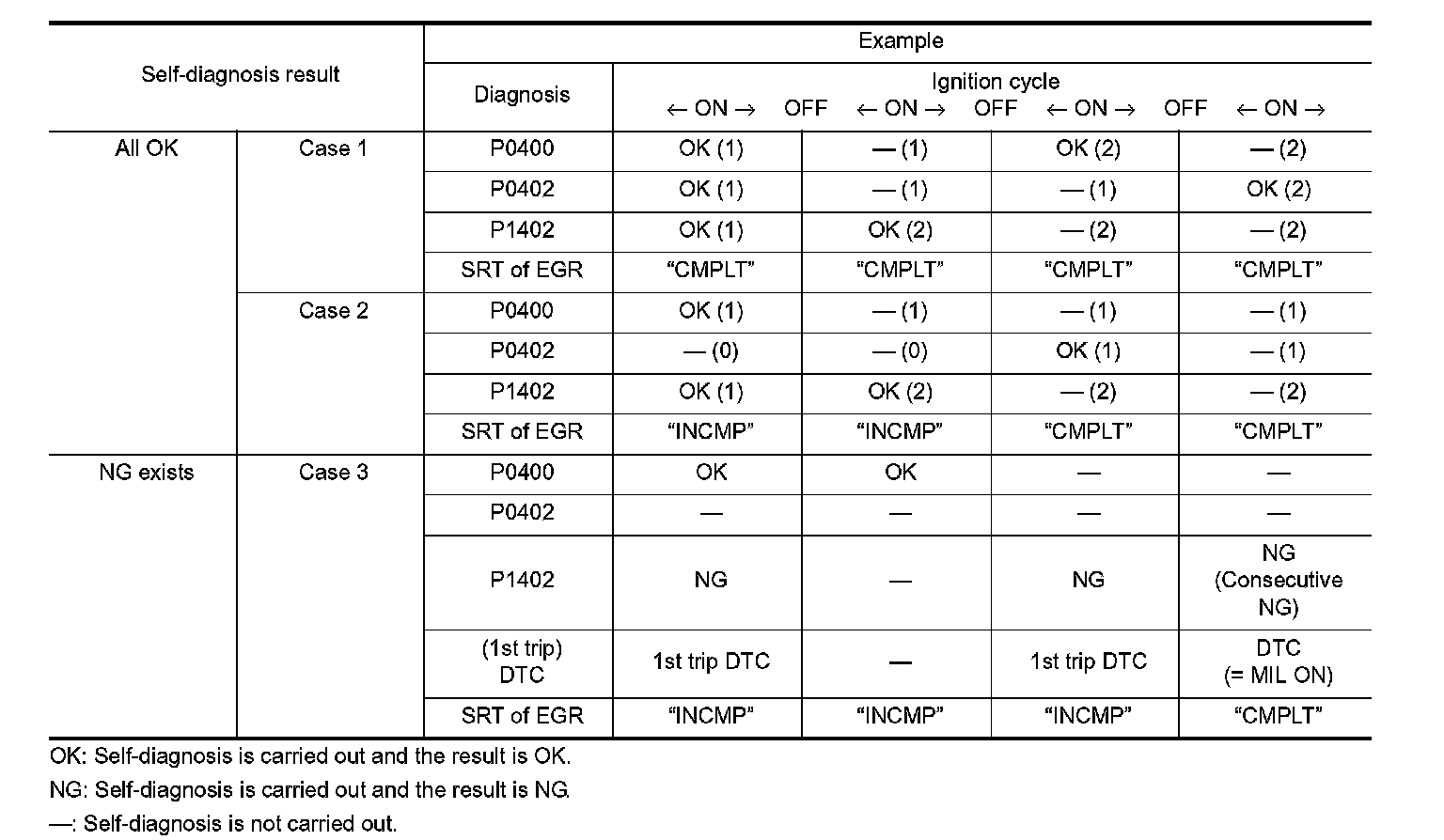 The table above shows that the minimum number of cycles for setting SRT as "INCMP" is the number one (1) for each self-diagnosis (Case 1 & 2) or the number two (2) for one of self-diagnoses (Case 3). However, in preparation for the state emissions inspection, it is unnecessary for each self-diagnosis to be executed twice