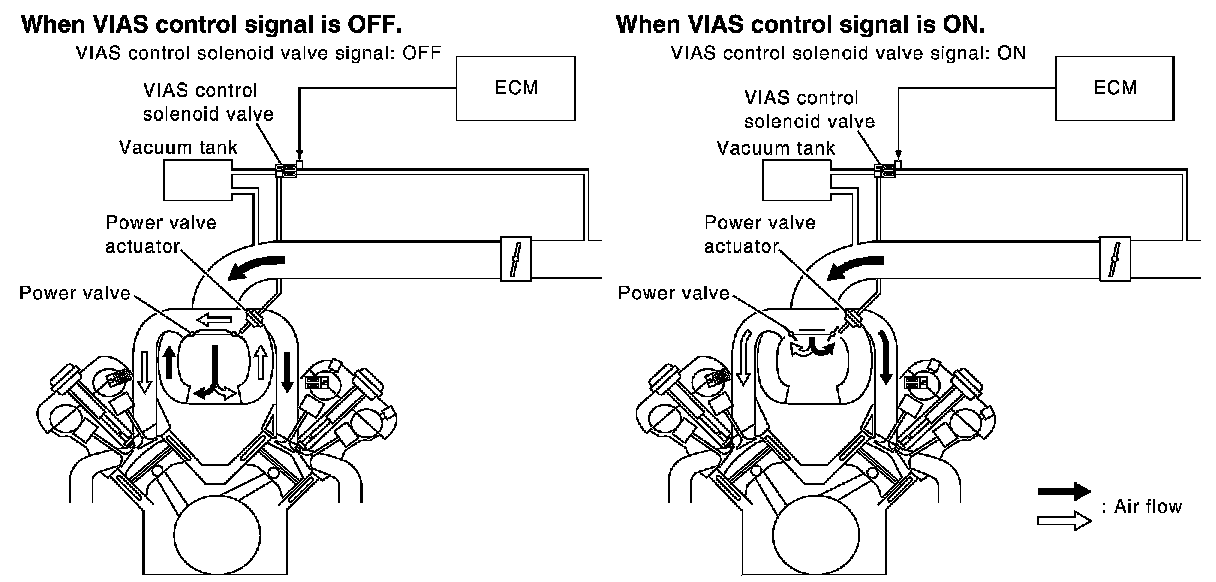 The surge tank and one-way valve are provided. When engine is running at high speed, the ECM sends the signal to the VIAS control solenoid valve. This signal introduces the intake manifold vacuum into the power valve actuator and therefore opens the power valve to two suction passages together in the collector.