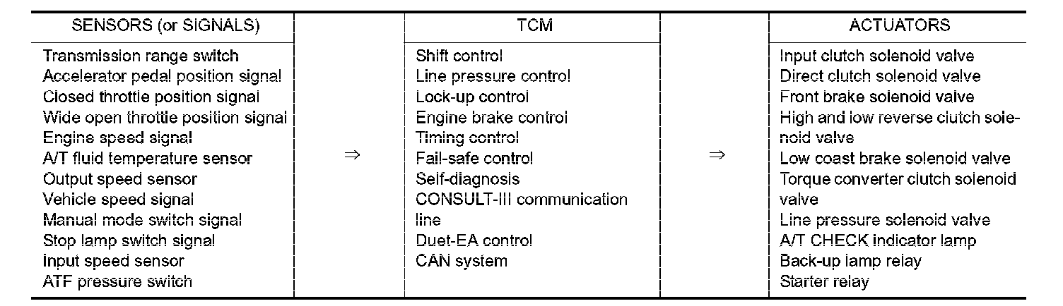 The A/T senses vehicle operating conditions through various sensors or signals. It always controls the optimum shift position and reduces shifting and lock-up shocks.