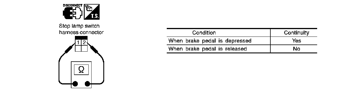 - Check continuity between stop lamp switch harness connector E124 terminals 1 and 2