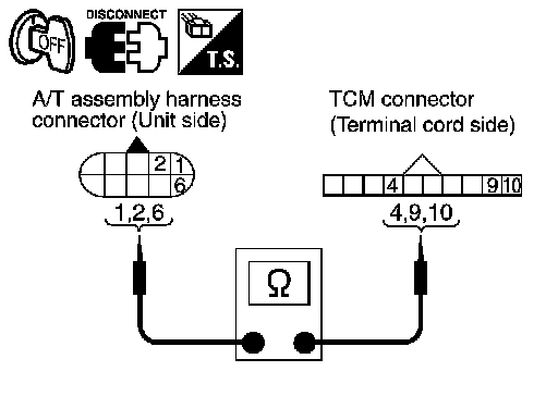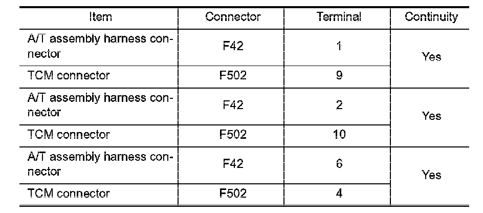 4. Check continuity between A/T assembly harness connector terminals and TCM connector terminals.