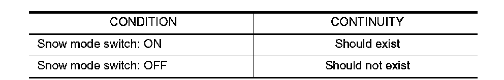 3. Check continuity between snow mode switch terminals 2 and 4 under the following conditions.