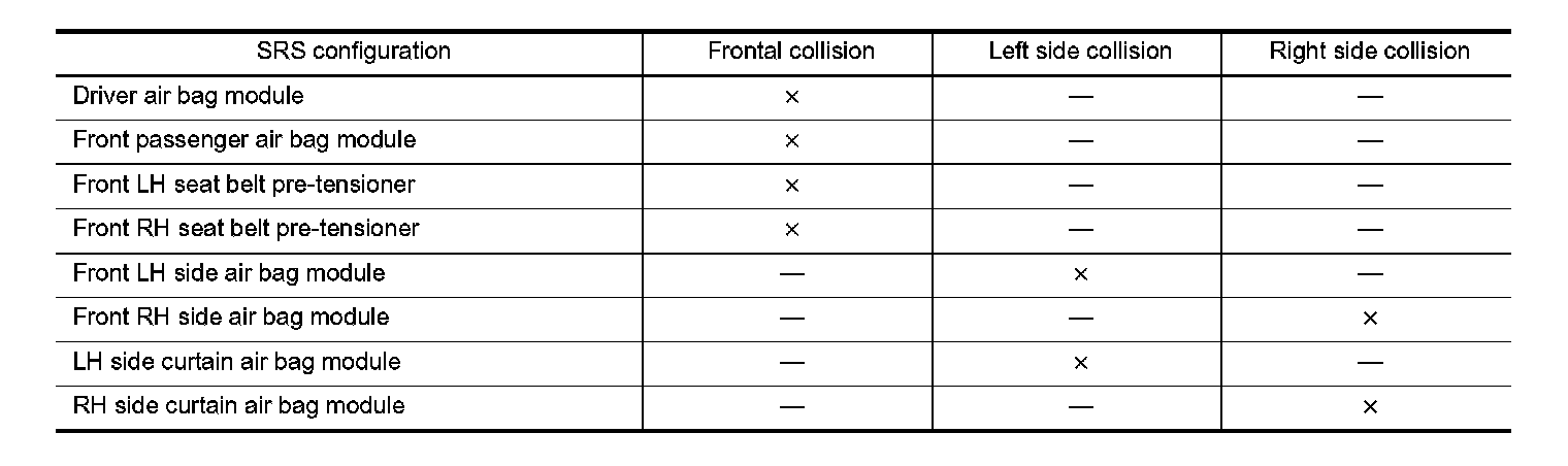 The collision modes for which supplemental restraint systems are activated are different among the SRS systems. For example, the driver air bag module and front passenger air bag module are activated in a frontal collision but not in a side collision.