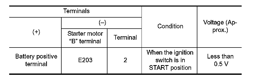 3. Check voltage between starter motor "B" terminal and ground.