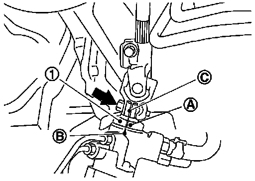 - Install slit part of lower joint (C) aligning with the projection (A) of rear cover cap (1). Make sure that the slit part of lower joint (C) is aligned with projection (A) of rear cover cap (1) and the marking position (B) of gear housing assembly.