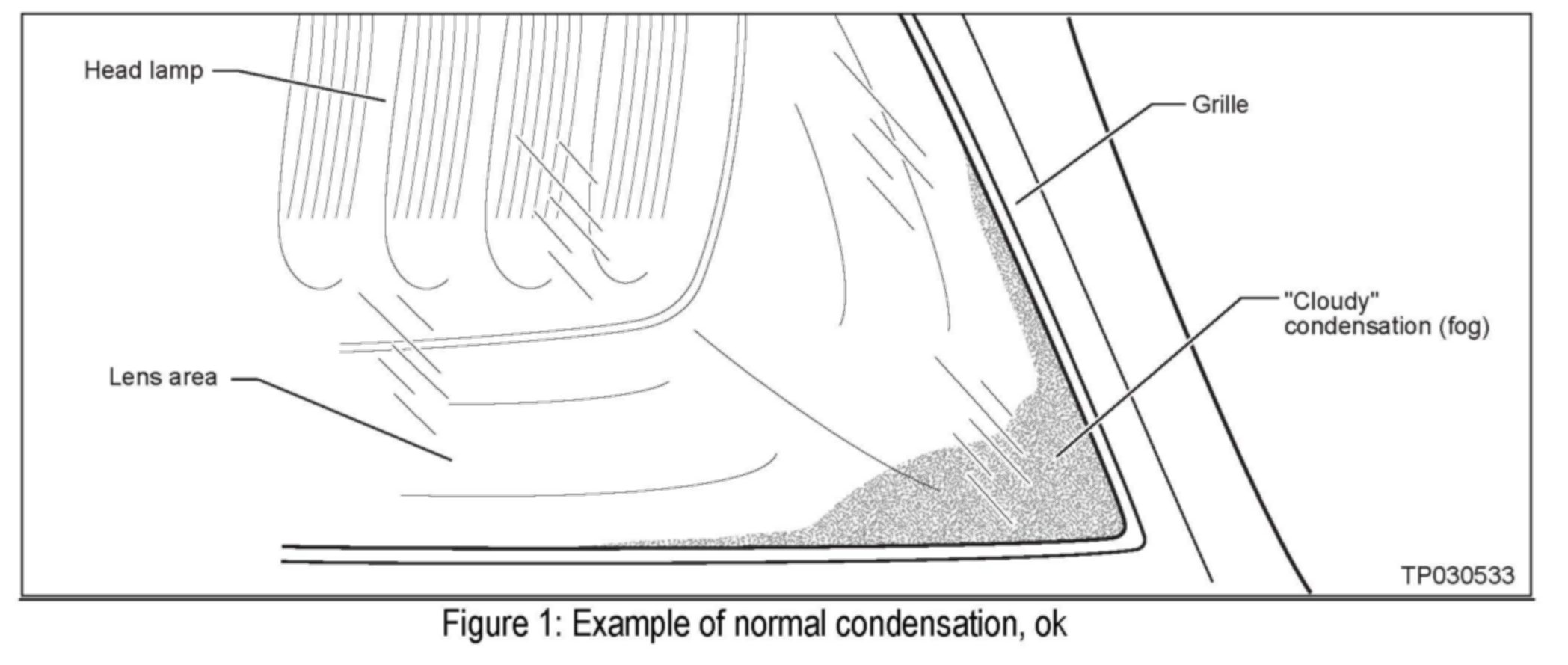 If the moisture trickles, drips, or pools it may not be considered normal and the headlamp assembly may have a water leak path. See Figure 2 for an example.