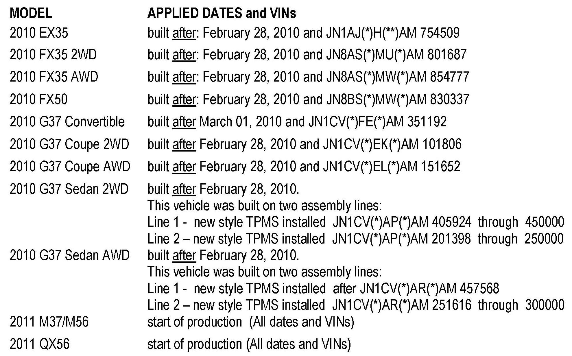 All 2011 Infiniti vehicles are equipped with the new style TPMS components.