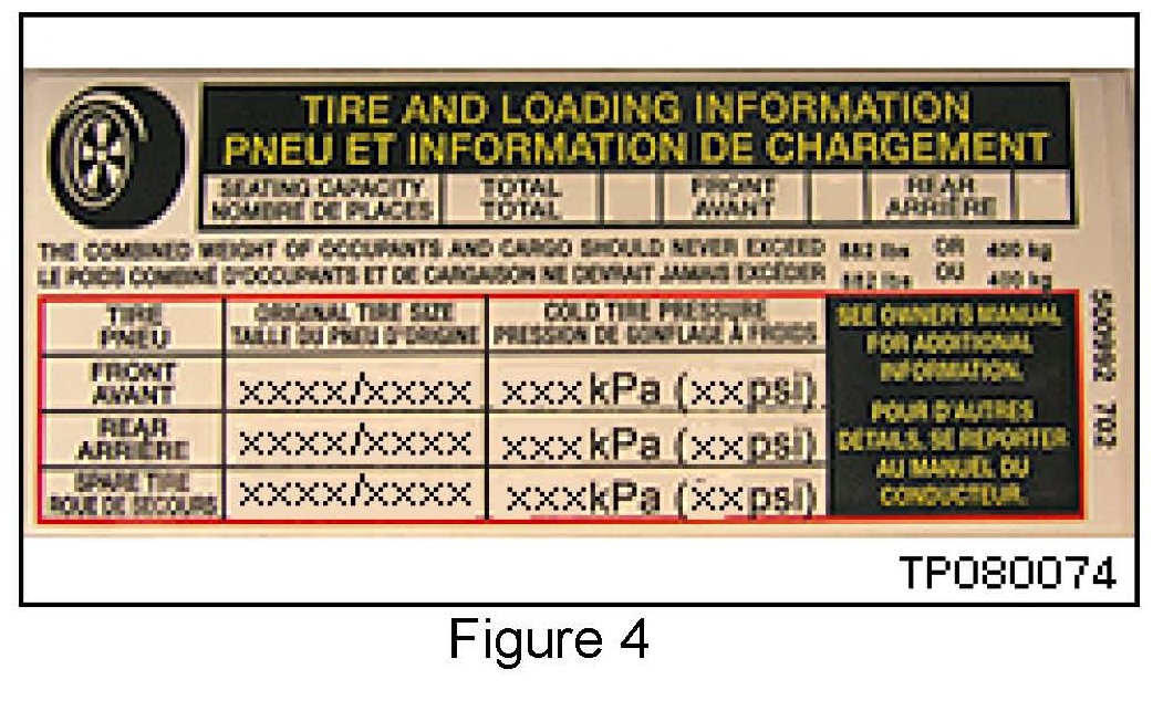 ^ For factory equipped tires, the tire pressure correct "Cold" setting is listed on the "Tire and Loading Information" placard (see example in Figure 4).