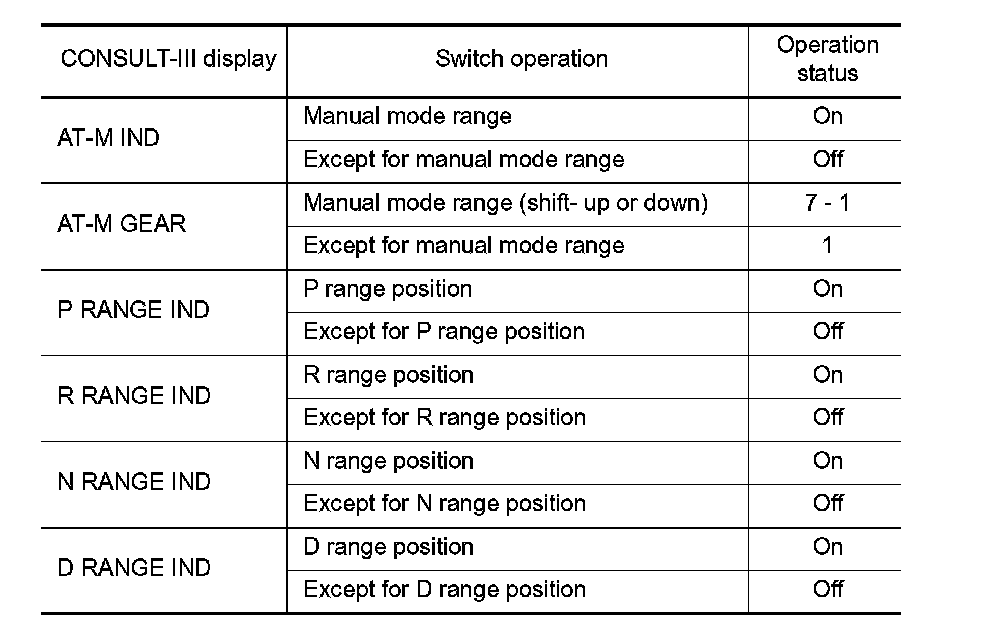 Use "Data Monitor" of "METER/M&A" on CONSULT-III. Confirm each indication on the monitor when operating the shift lever.