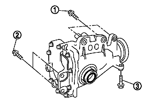 - Tighten mounting bolts in the order as described below when installing front final drive assembly: upper side of gear carrier (1), part of carrier cover (2), lower part of gear carrier (3).