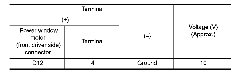 2. Check voltage between power window motor (front driver side) connector and ground.