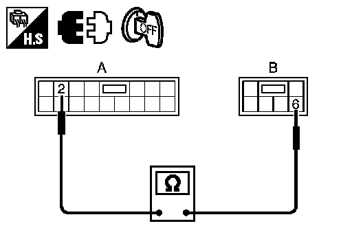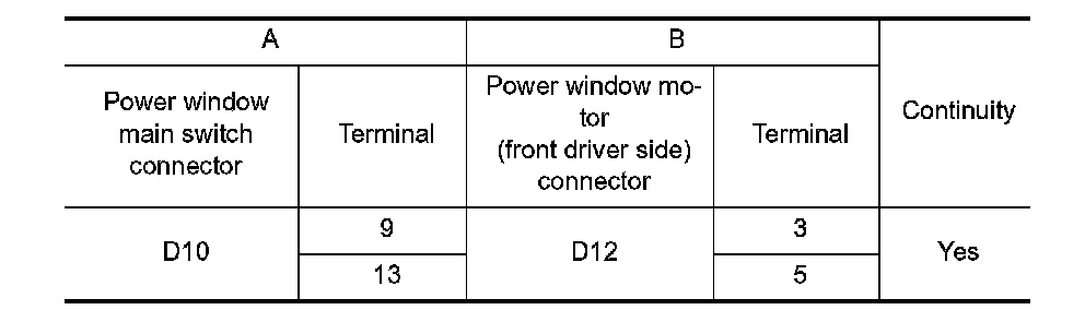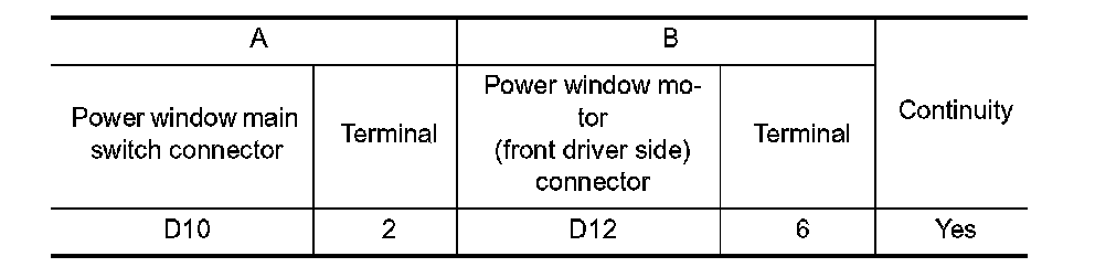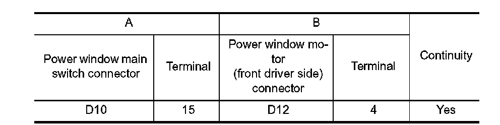3. Check continuity between power window main switch connector and power window motor (front driver side) connector.
