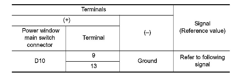 3. Check signal between power window main switch connector and ground with oscilloscope.