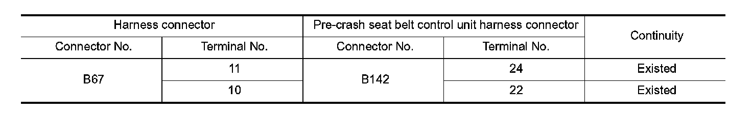 2. Check the continuity between the harness connector and the pre-crash seat belt control unit harness connector.