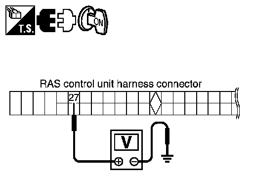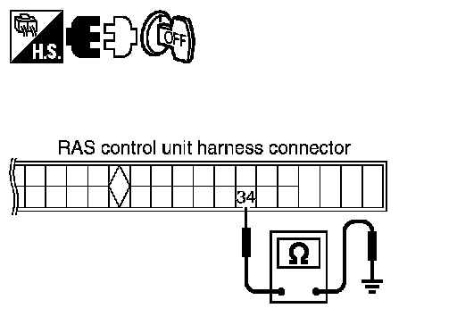 Turn ignition switch OFF, disconnect RAS control unit harness connector, and check terminal for deformation, disconnection, looseness, etc.