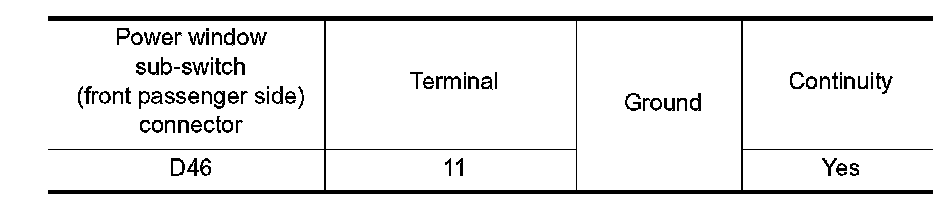 4. Check continuity between power window sub-switch (front passenger side) connector and ground.