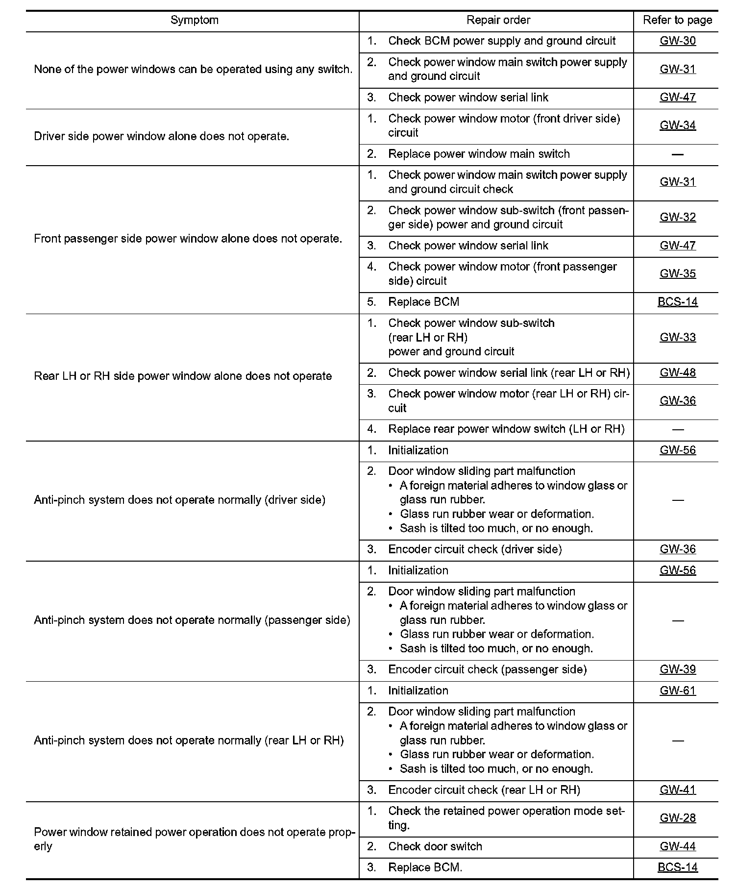 Trouble Diagnosis Symptom Chart