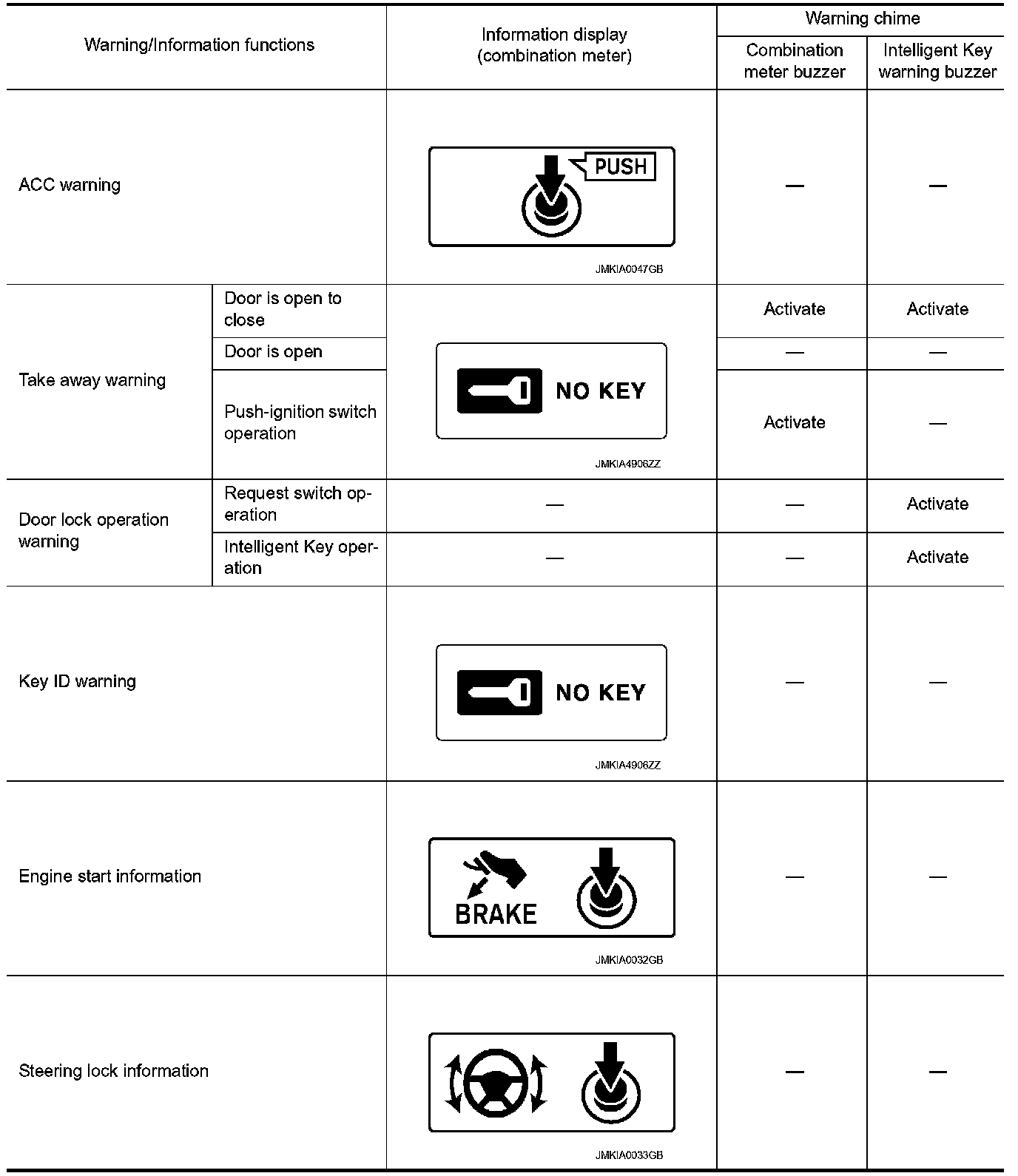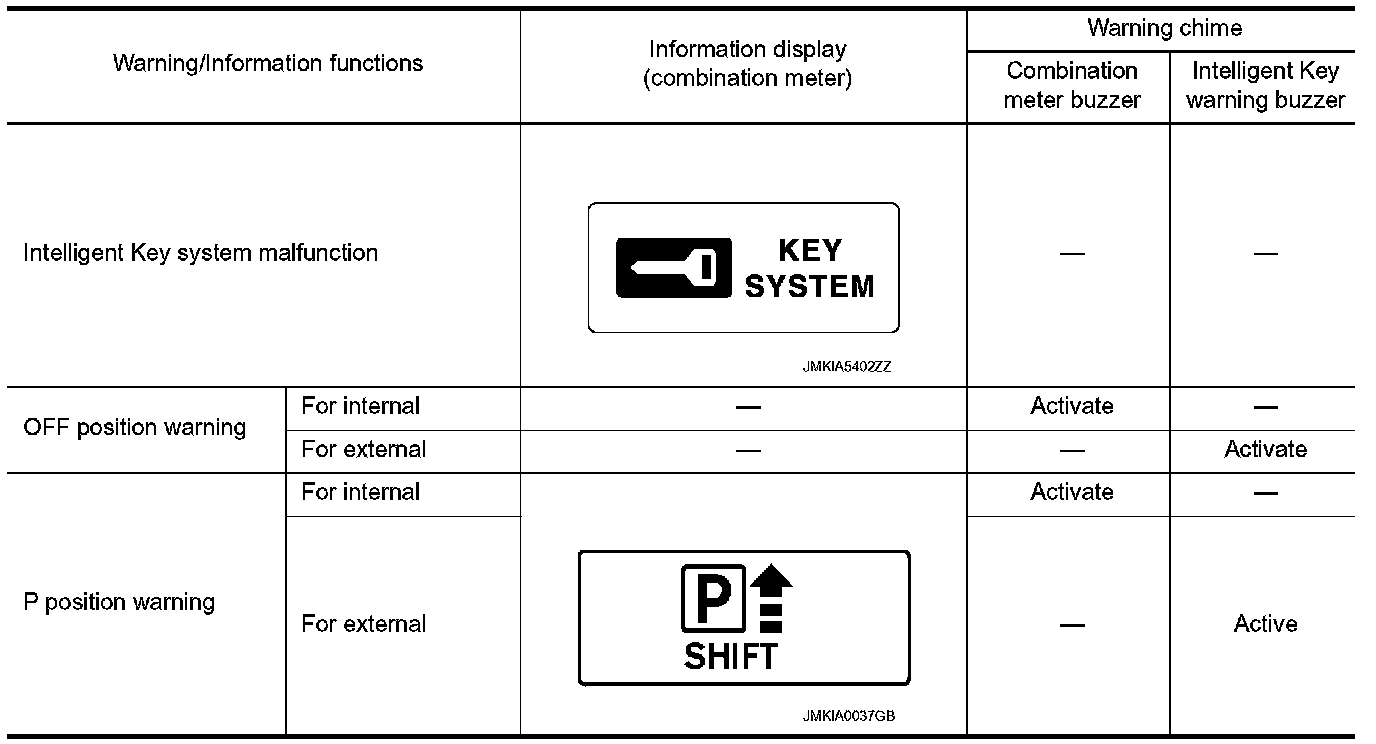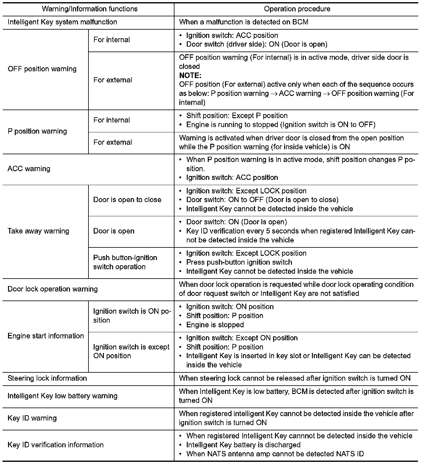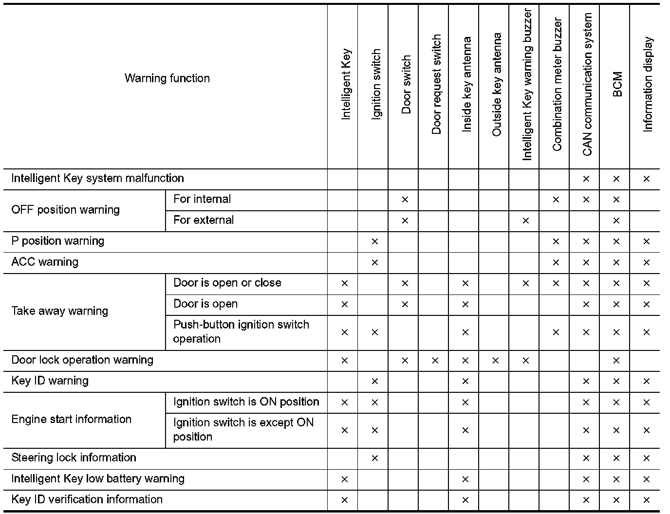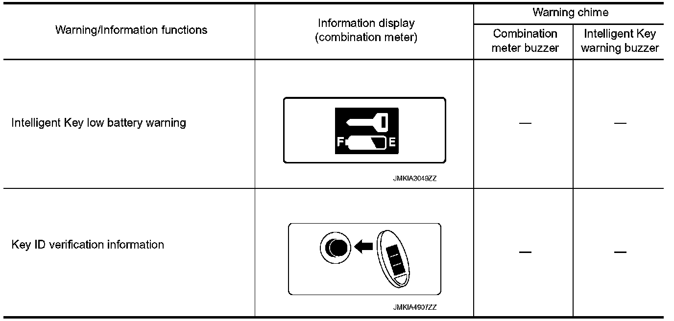 The warning function are as per the following items and are given to the user as warning information and warnings using combinations of Intelligent Key warning buzzer, combination meter buzzer and information display in combination meter.