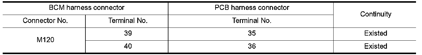 2. Check the continuity between the BCM harness connector and the PCB harness connector.