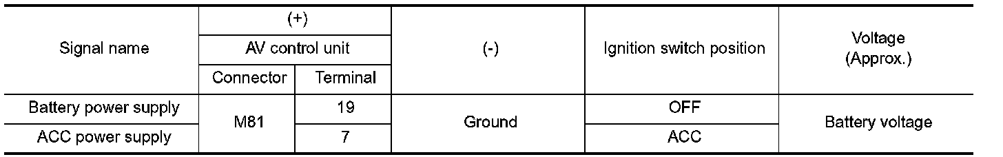 Check voltage between AV control unit harness connectors and ground.