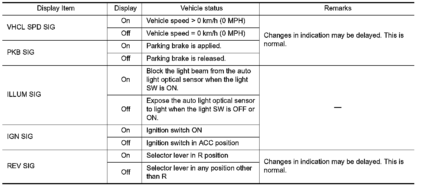 - Displays the status of the following vehicle signals inputted into the AV control unit.