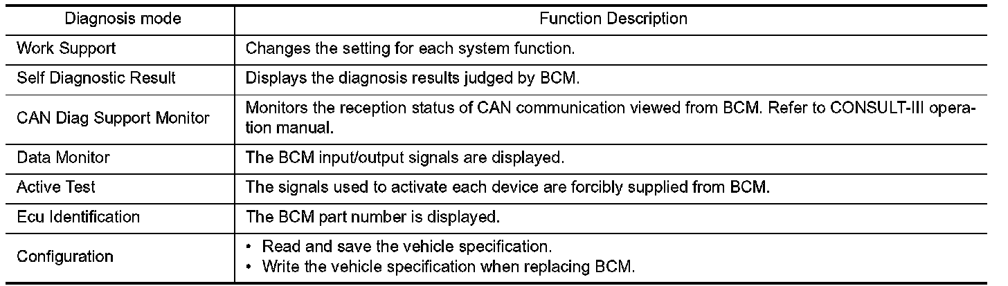 CONSULT-III performs the following functions via CAN communication with BCM.
