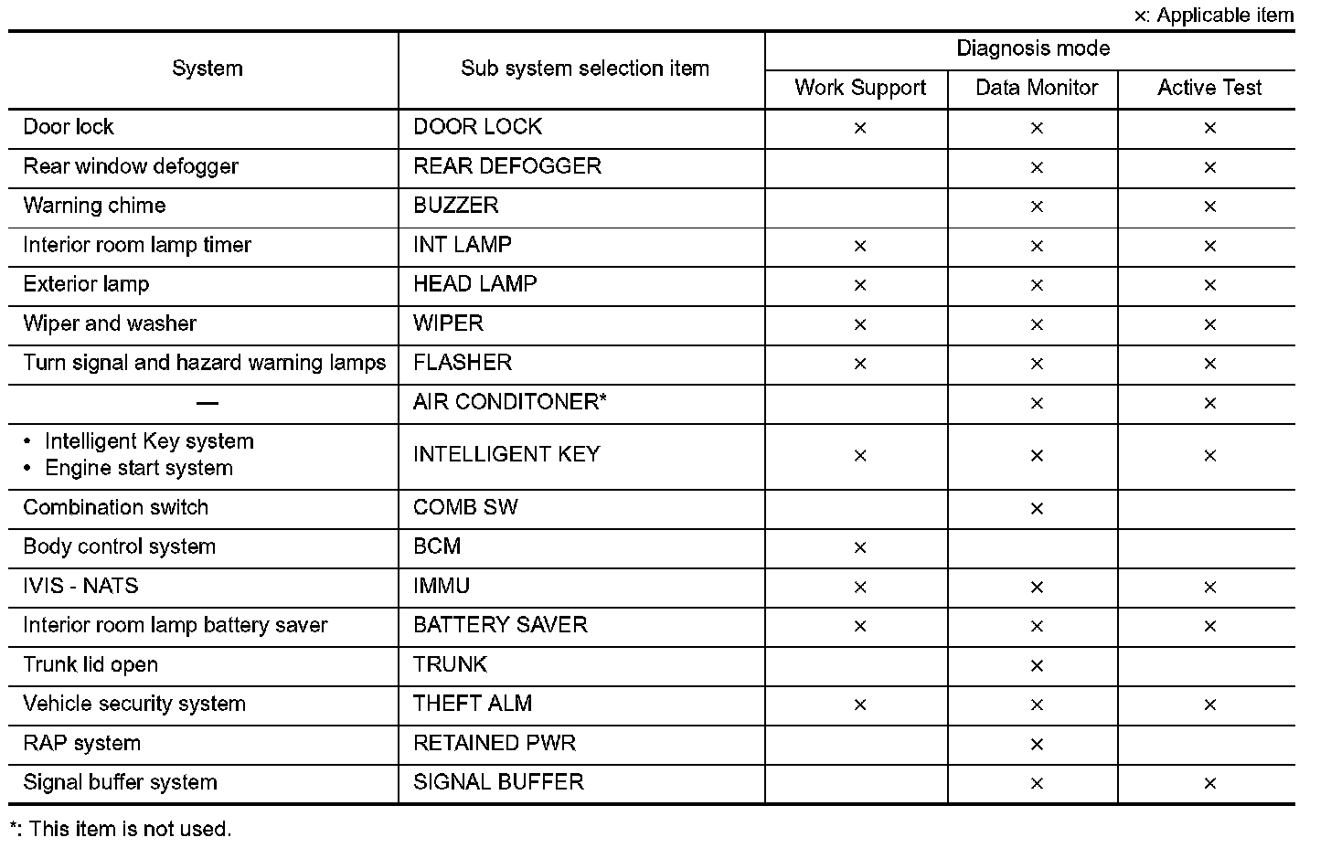 It can perform the diagnosis modes except the following for all sub system selection items.