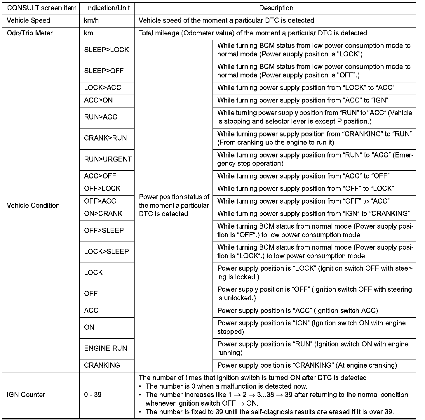 The BCM records the following vehicle condition at the time a particular DTC is detected, and displays on