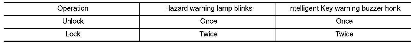 During lock, unlock, operation by each request switch, the hazard warning lamps and Intelligent Key warning buzzer will blink or honk as a reminder.