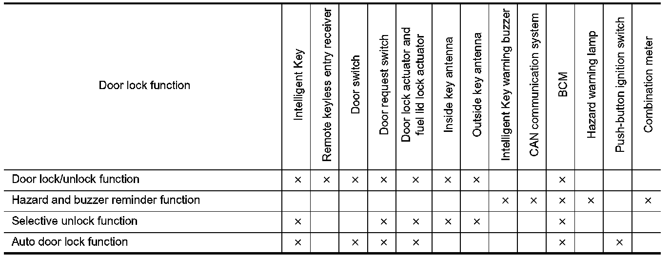 - BCM lock/unlock each door and fuel filler lid and sounds Intelligent Key buzzer warning (lock: 2 time, unlock: