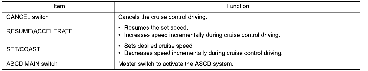 AUTOMATIC SPEED CONTROL DEVICE (ASCD) AUTOMATIC SPEED CONTROL DEVICE (ASCD) : Switch Name and Function