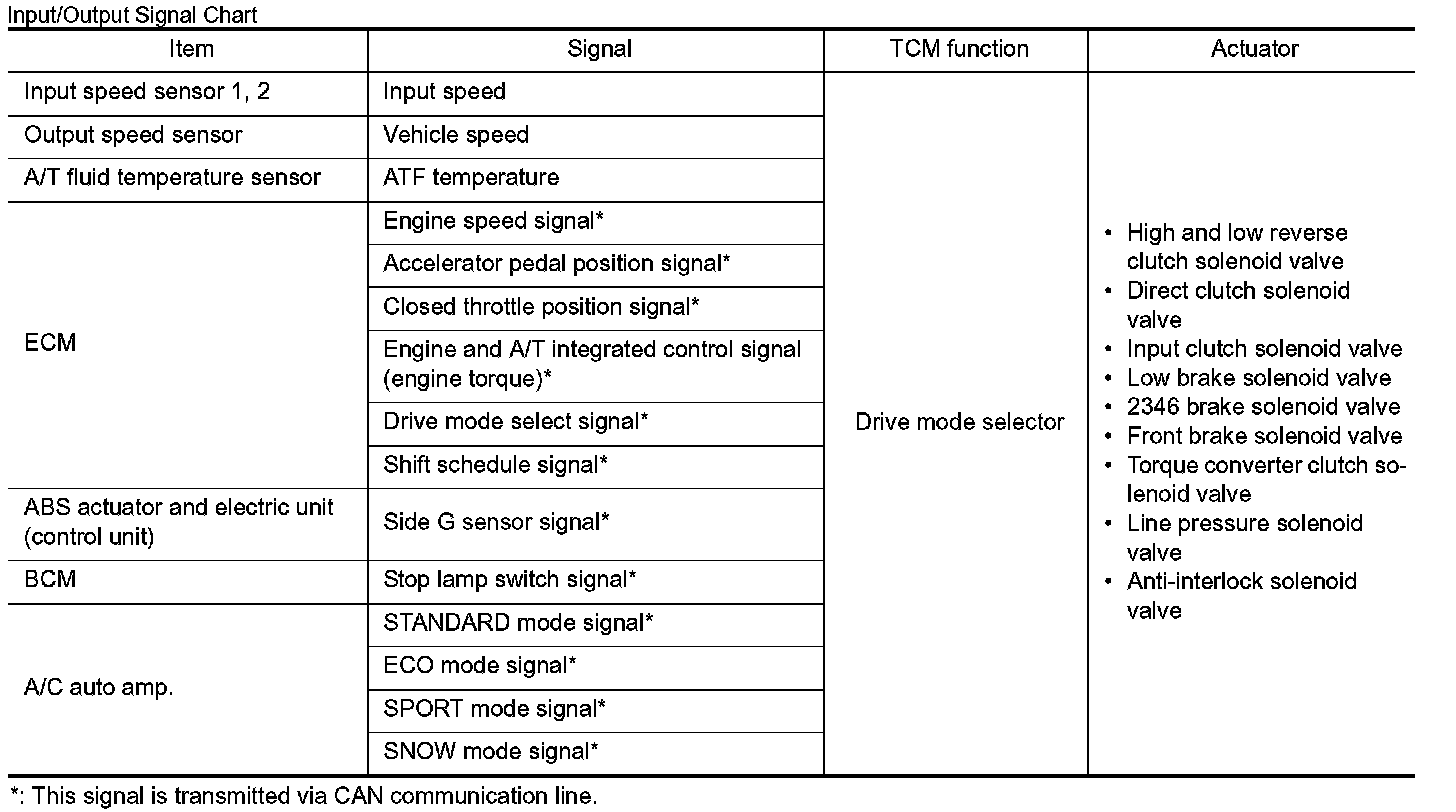 - TCM transmits recognized mode and gear shift line select result to ECM via CAN communication (by drive mode select signal and shift schedule signal).