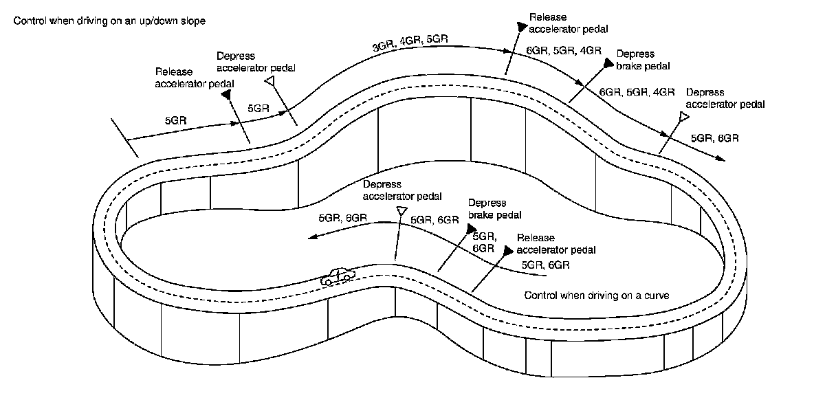 Fixing at 4GR, 5GR or 6GR on an up-slope prevents shift hunting and controls the vehicle to gain optimum driving force. On a down-slope, automatic shift-down to 4GR, 5GR or 6GR controls to gain optimum engine brake.