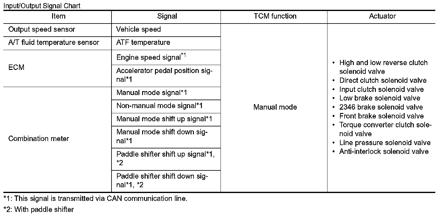 - The TCM receives the manual mode signal, non-manual mode signal, manual mode shift up signal, manual mode shift down signal, paddle shifter shift up signal* and paddle shifter shift down signal* from combination meter via CAN communication line. The TCM shifts shift pattern control to the manual mode based on these signals, and then shifts the A/T by operating each solenoid valve according to the shift operation of the driver.