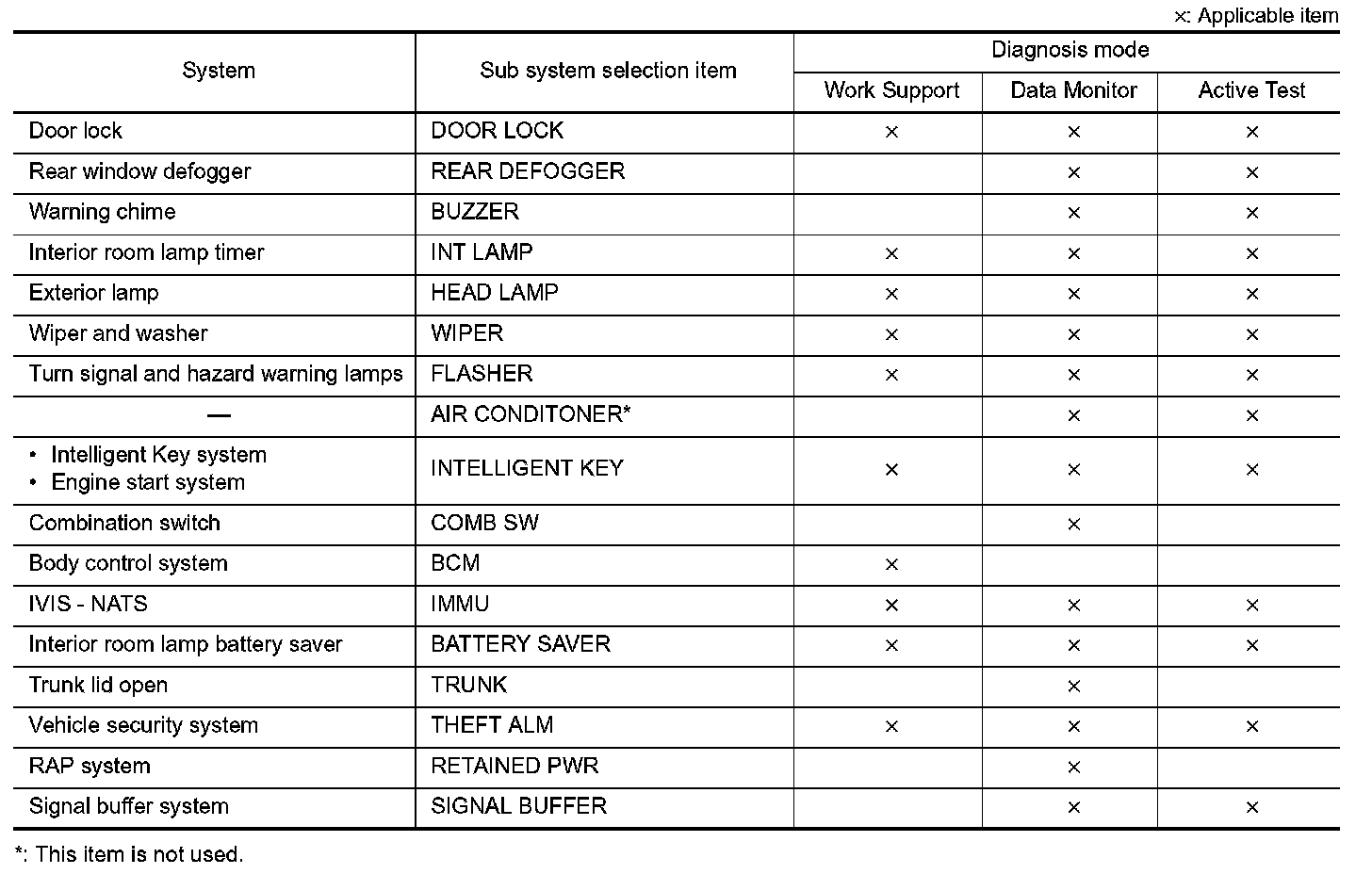 It can perform the diagnosis modes except the following for all sub system selection items.