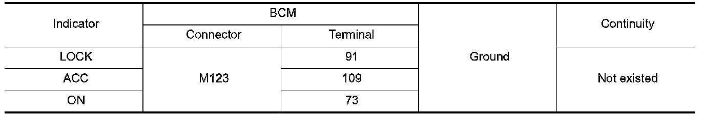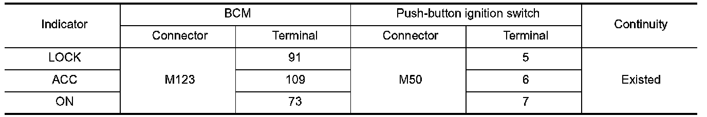 Check push-button ignition switch ("LOCK INDICATOR", "ACC INDICATOR" and "IGNITION ON IND") in