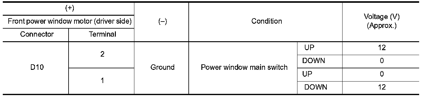 4. Check voltage between front power window motor (driver side) harness connector and ground.