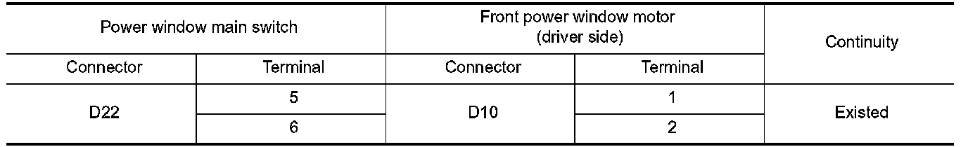 3. Check continuity between power window main switch harness connector and front power window motor